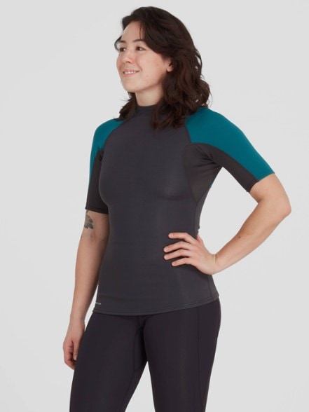 Designed to keep your core warm while still being breathable for active paddling adventures, the women's NRS HydroSkin 0.5 short-sleeve shirt is perfect for hot days in cold water.