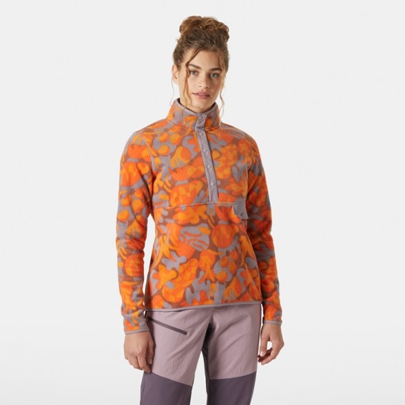 A high collar and buttoned placket add to the cozy feel of the women's Helly Hansen Maridalen Printed Fleece pullover, while the graphic print keeps the vibe of this mid layer playful.