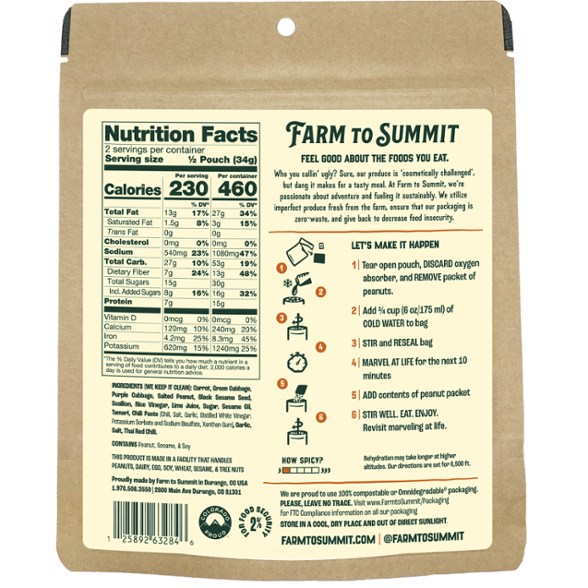 A cold-soak staple, the Farm to Summit Thai Carrot Slaw will give you your fresh veggie fix when you're deep in the backcountry. Great for dinner or lunch by itself or combined with hummus and a wrap.