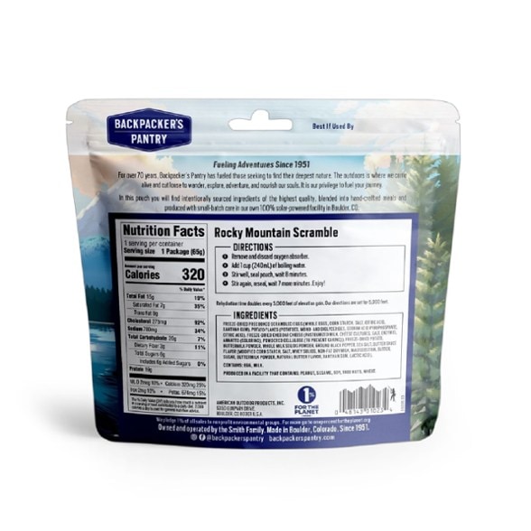 A breakfast worthy of the view, the Rocky Mountain Scramble from Backpacker's Pantry is a classic combo of peppery scrambled eggs, potatoes and cheddar cheese.