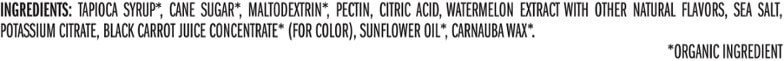 Salted Watermelon: Tapioca Syrup*, Cane Sugar*, Maltodextrin*, Pectin, Citric Acid, Watermelon Extract with other Natural Flavors, Sea Salt, Potassium Citrate, Black Carrot Juice Concentrate* (For Color), Sunflower Oil*, Carnauba Wax*. *Organic Ingredient.