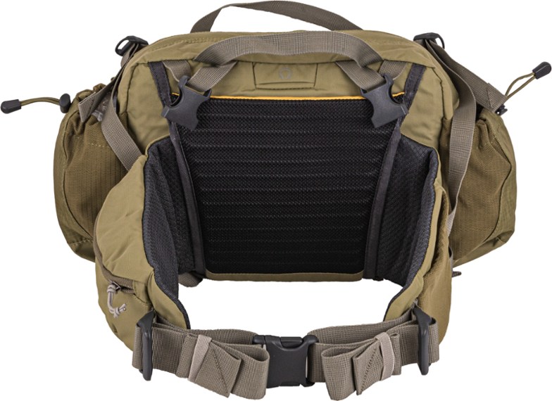 Fit Note: I wear 30" - 32" waist pants and I have to cinch down the hip strap on this pack within 1/2" of its minimum size. If you're smaller than me this pack may not go small enough to ride correctly on your hips. I tried all three of Mountainsmith's lumbar packs. The smaller Drift pack fit well but lacked the features I wanted and didn't carry enough. The larger Day pack felt very big when worn. This model is an excellent compromise. After rupturing a lumbar disc, many of my favorite activities are off the table. I can still hike though -- I just can't wear a backpack. This bag lets me go for long dayhikes without making my partner carry all the essentials and food, because the load is entirely on my hips. It's also great for bringing along toys, treats, and water when taking the dogs to the park. The volume is just enough -- with thoughtful packing -- to bring along the 10 essentials plus lunch and layers in fair weather. I like having nothing on my shoulders; my arms can move freely for scrambling and my center of gravity is low. It's cooler in warm weather but also warmer in cold weather because the insulation in my jacket isn't compressed across my shoulders. I like that I can spin it around my waist for quick access to contents, even while walking. Yet, it is a surprisingly stable. I would absolutely not run with this bag, but it's secure enough for hustling down scree or boulder-hopping. ORGANIZATION The water bottle pockets are versatile - they fit a 32oz. nalgene, 24oz. hydroflask, or bike-type water bottle. I've never had a bottle pop out by accident, yet I can get them in and out while walking (with practice). Very few "normal" backpacks allow that! I like the oversized zipper pulls (gloves), the quick stash pocket is large enough to actually be usable (again, gloves!), and the bright inside lining is very helpful when hunting for small items. The dividers and zipper are well-placed; easy to access but if you're not using them, they don't get in the way. The hip pouches are also well-done; they're not so big as to rub inside my forearms when I walk, but hold enough to be valuable. I comfortably carry my phone, keys, dog-poo bags, and energy bar, and can get items in/out without fussing. The left-side stretchy mesh pocket fits a range of object sizes and shapes and prevents them from bouncing. It's best for phone-shaped items, though. My iPhone 13 goes in and out with one hand. STRAPS There are "delta straps" to snug the pack up against your back, plus top and bottom compression straps to keep it from bouncing when it's not full. All those extra straps stay out of the way pretty well, unlike some packs which seem to just be straps everywhere! Speaking of: the hip straps tuck away behind the padded panel, which keeps them from getting hung up in car doors or flopping around if you're carrying by the handles. This also means there is a "tunnel" behind the lumbar pad, so you can stuff something in there if you need more support. CRITIQUES This pack is solid on all major points, but there are a few details that could be better for me. I don't use the included shoulder strap nor the optional strapettes. It's cool that these options exist but the upper anchor points for them get in my way. The bottom anchors are nicely-hidden metal rings, but the top anchors are plastic side-release buckles on large webbing loops. They don't tuck away anywhere and tend to flop over the zipper opening when I spin the bag around to the front, which often makes re-zipping a hassle. I wish the top anchors were the same as the bottom ones: low-profile metal rings. The double carry-straps get in my way. Obviously they are good to have, but I would prefer a low-profile handle that lies close to the body of the pack. These straps tend to flop into the main compartment and slow down access -- and there's two of them! Also, they make the bag look visually messy, and honestly a little bit cheap since they are just simple webbing loops. The hip straps have very long tails. This is unavoidable because of the forward-pull adjustment arrangement (which I like very much), but I wish there were some integrated way to manage all that extra slack while wearing the bag. Like if it could be tucked behind a flap or strap somewhere. I usually cram them into my lumbar area but they tend to work their way out. The bottom compression straps were a bit disappointing for me. I was hoping to use them for lashing a jacket to the outside of the bag -- the provided stuff-pouch is big, but can't fit a jacket if the rest of the bag is already full. Unfortunately the strap length is optimized for compression only; there's no extra to accommodate the bulk of a jacket. This avoids having long 'tails' slapping around all the time, which is good -- but I do wish there were some integrated way to strap on extras. If not the compression straps, then maybe a set of anchor points where I could attach my own straps, which I have plenty of. This is a solid pack that solves a real problem, and is genuinely nicer to use than a small conventional backpack. I will definitely continue using it even after my back is strong enough to carry a load again, because it's so nice to carry!