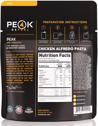 Recharge after a tough climb or hike with PEAK REFUEL Chicken Alfredo Pasta, a protein-rich mix of real chicken breast, creamy cheeses and Alfredo sauce that's served up mush-free to hit the spot.