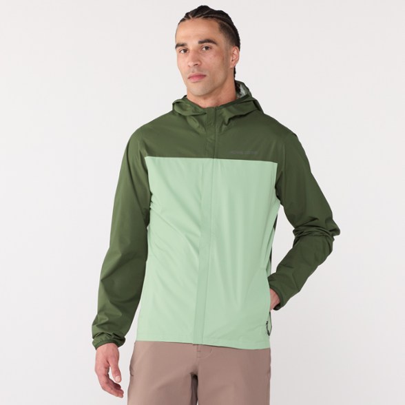 Enjoy your rides in wet weather with the men's PEARL iZUMi Canyon 2.5L WxB rain jacket. It provides dependable waterproof/breathable protection and has a hood that fits over your helmet.