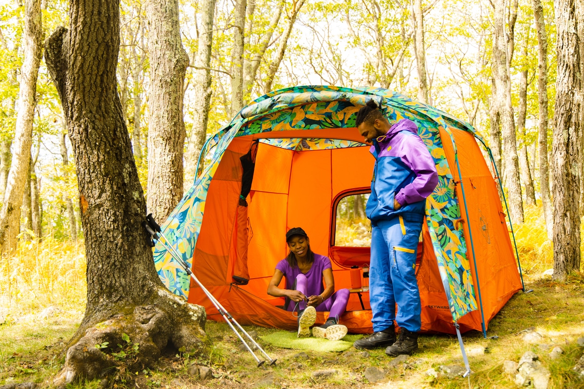 For this updated collection, Outdoor Afro Inc. and REI invited members of the Black community to participate in a sleep insights study and offer feedback on the new collaborative tent and sleep systems. The result? An oversize satin camp pillow that supports all hair types and styles, including natural and curly textures, by reducing frizz-creating friction; a convertible comforter that can be used as a blanket, sleeping bag or double-wide cover for two; and a bold, bright new tent that has space to stand and stretch—all featuring Alexander’s beautiful natural-abstract imagery. “During this project, I wanted to visually create something enticing and inviting for this community,” Alexander says.