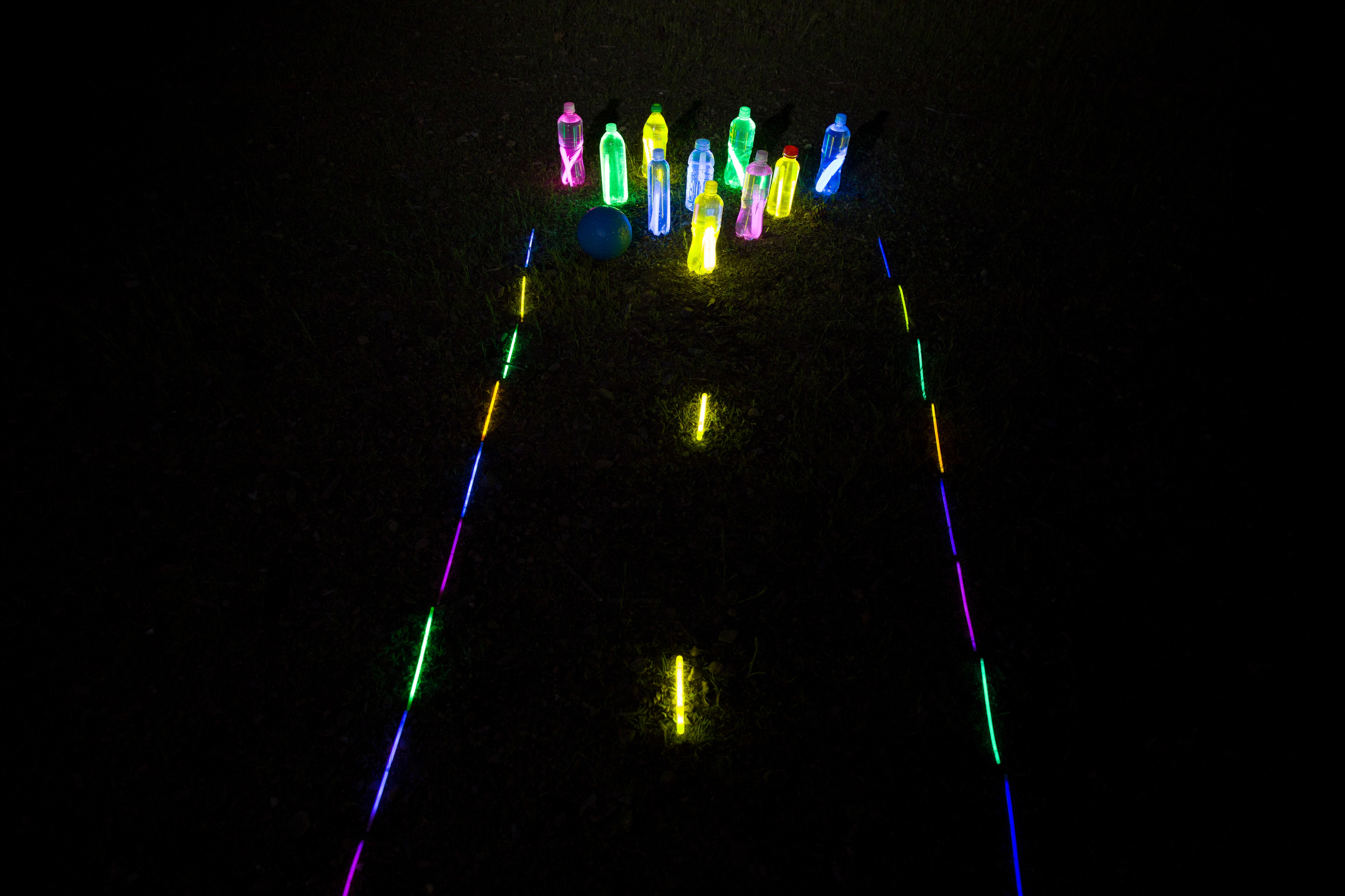 Line up your pins in the classic triangle formation. You can use more glow sticks to create a bowling lane if you want to take it to the next level.