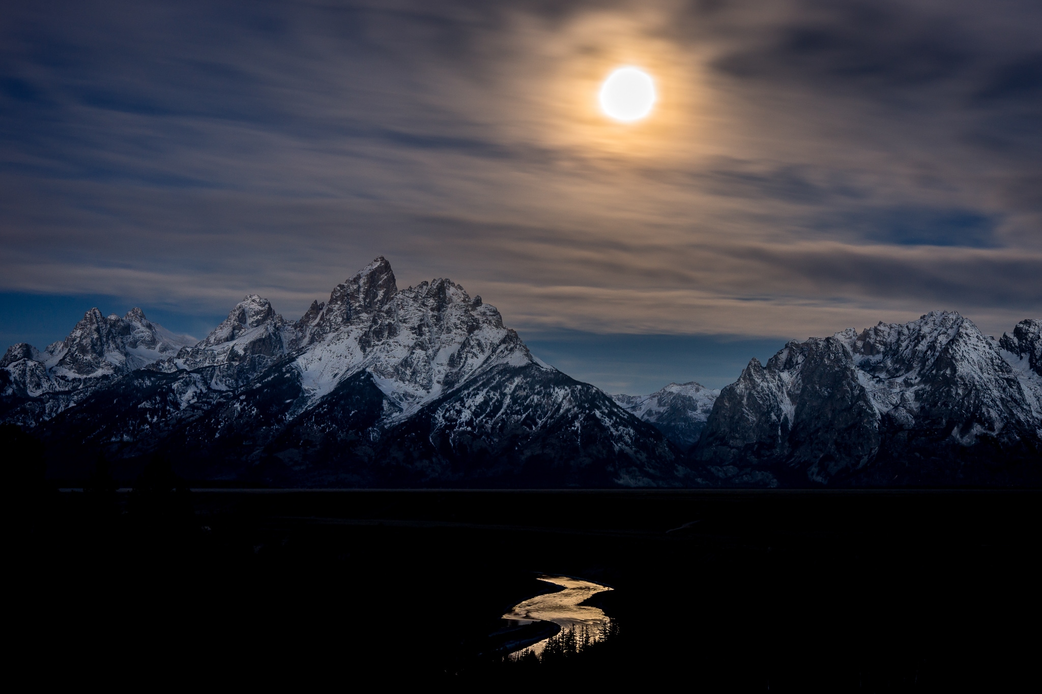A notch in the south ridge of the Grand Teton cradles the full moon as it makes its way to the western horizon in the minutes before dawn.