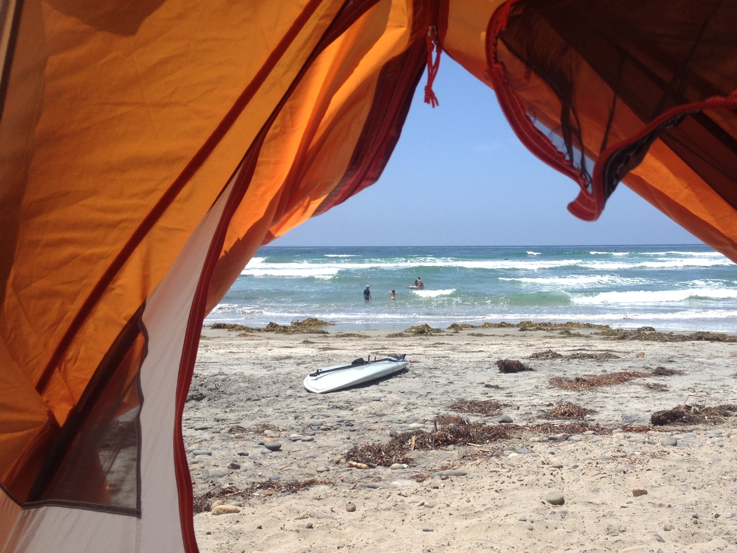 When I come back from paddling my SUP 14′ displacement board along that wide stretch of ocean under the cliffs, I need to take care of both myself and my equipment. Having both an A-frame stand and a homemade PVC-pipe stand makes it easy for me to rinse all my gear. This is similar to what I do at home and since we brought our car, we can add the amenities to make it feel like an extension of the garage. Keep your equipment protected by giving it its own spot at the campsite. Using the same portable shower with pressurized hose that I used on the boards, I can rinse the salt off myself. Set up the shower between the car and the tent for a bit of privacy. It’s very convenient in a state suffering from a drought where most campgrounds are rationing the water.