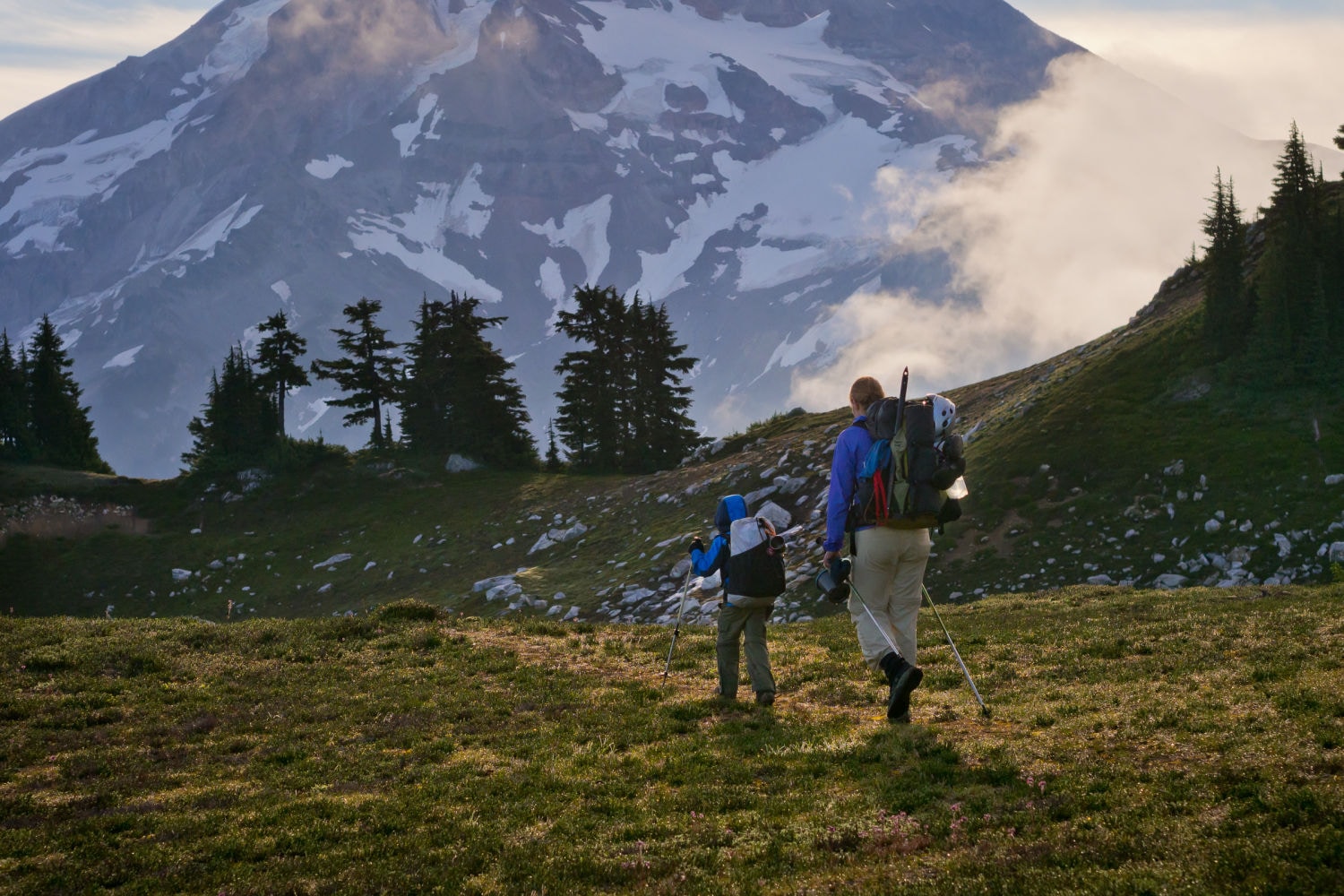 Left: Water duty at Third Lake. Right: Down time at Sahale Glacier Camp.