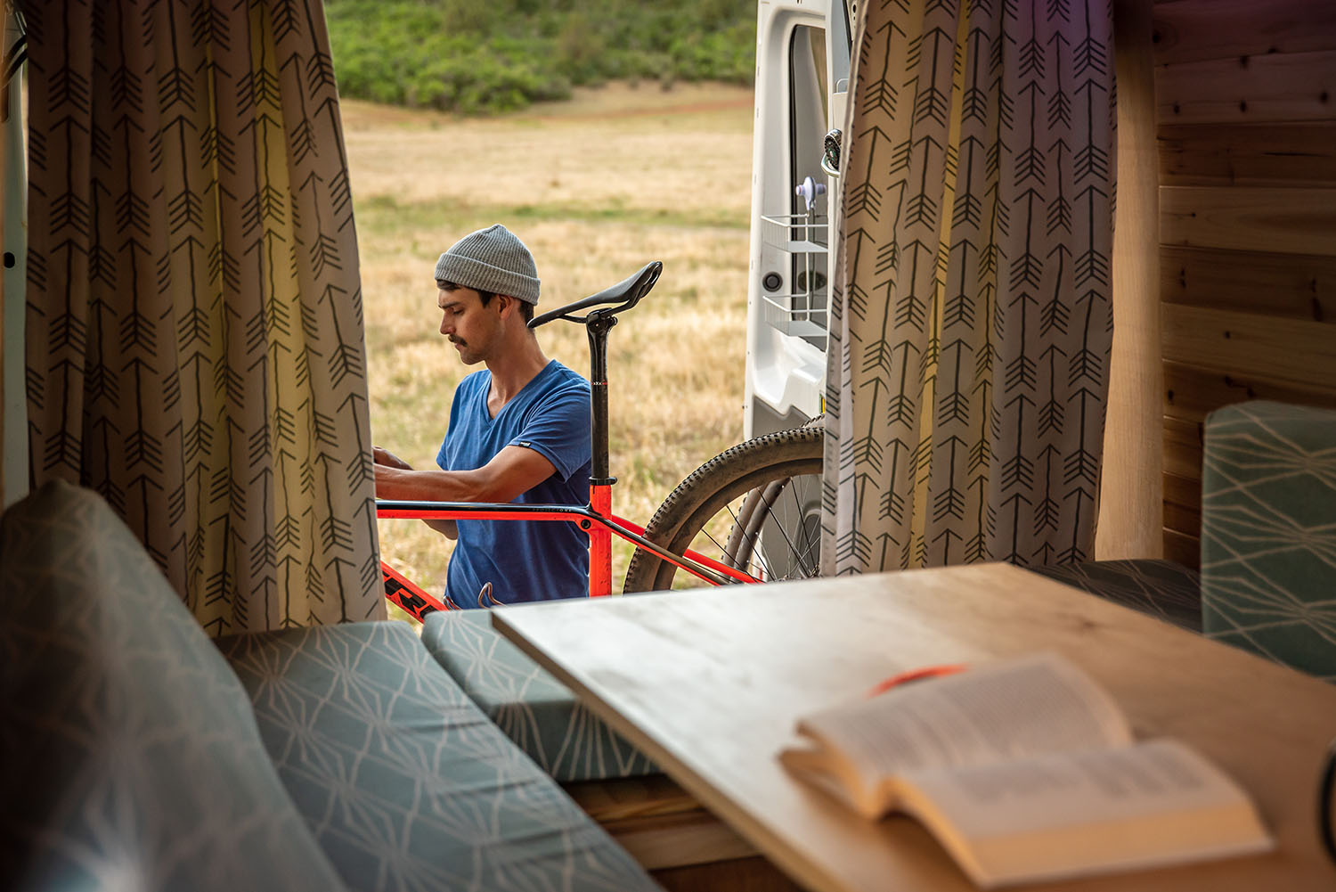 The internet is chock-full of plans, designs and DIY tips for customizing your very own digs-on-wheels. But McElveen’s needs were specific to mountain biking and racing—and bikes aren’t exactly compact. He had to be smart with design and conservative with space. He also says that most of the van life blogs tend to glorify the experience and use fish-eye lenses to make the space look bigger than it actually is. In reality, it’s a lot of work, says McElveen.