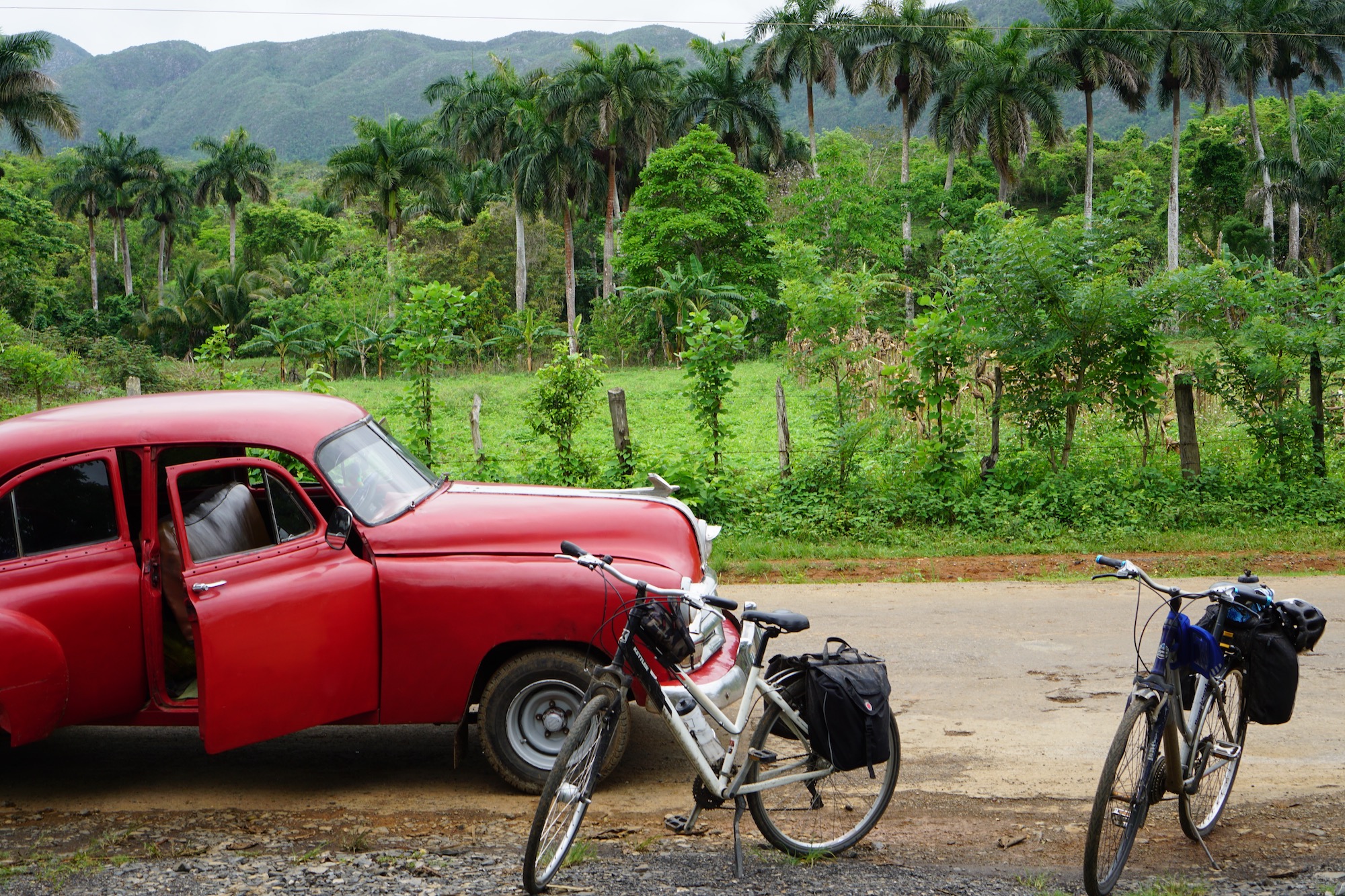 We showed up at Mario and Antonia’s house with water pooling off our helmets and splatters of red mud tattooing our backs and legs. “You’re on bikes!” Antonia exclaimed, shooing us into the covered patio from the wet weather. She and Mario promptly got to work making us feel comfortable; we removed the panniers from the bikes, and Mario took them back outside to hose them off. We were shown to our room, which was clean and basic, instructed to take warm showers, and told that dinner would be ready shortly (cigars and beer were also available). Due to an unseasonal tropical storm following us around the island, this scenario—our arriving sodden and apologetic and our hosts scurrying to make us comfortable—would play out almost every day we were in Cuba. We stayed with Miguel, a math teacher and permaculture farmer in Viñales; Yoslaidy, who shared my exact birthday, in Santa Lucia; and Mary, a veterinarian, in Havana. Each one of them became a portal into life in Cuba, and we left with promises to stay in touch and hopefully meet again.