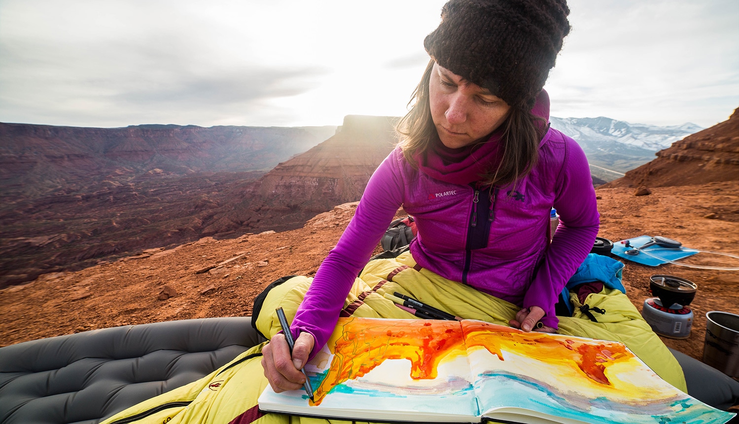 For inspiration, she rides her backyard trails in the Roaring Fork Valley, cruising under the shadow of 12,966-foot Mount Sopris. Riding clears her mind and being in the wild invigorates her. She rides hard and fast. Other days, she packs up her watercolors and heads for the hills by foot to paint on location.