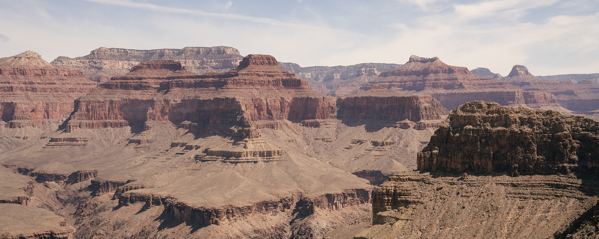 From the Bright Angel Trailhead, head east along the Rim Trail toward the village. Follow the entire length of the Rim Trail to the junction with South Kaibab Trail. There is year-round water access here, so be sure to top off all your bottles before heading into the canyon. Once ready, you’ll drop steeply into the canyon via a series of tight switchbacks. The trail is in good shape but the dirt can feel slippery underfoot due to the steep grade. After a couple miles, the grade eases a bit as it wraps around O’Neill Butte. Given that there are few trees along this trail, the views are stunning but the summer sun is blistering—bring adequate protection. Hiking from the rim to the river you will traverse nearly 1 billion years of geologic time. Keep an eye out for unique geologic features, fossils and note the various rock types you pass by.