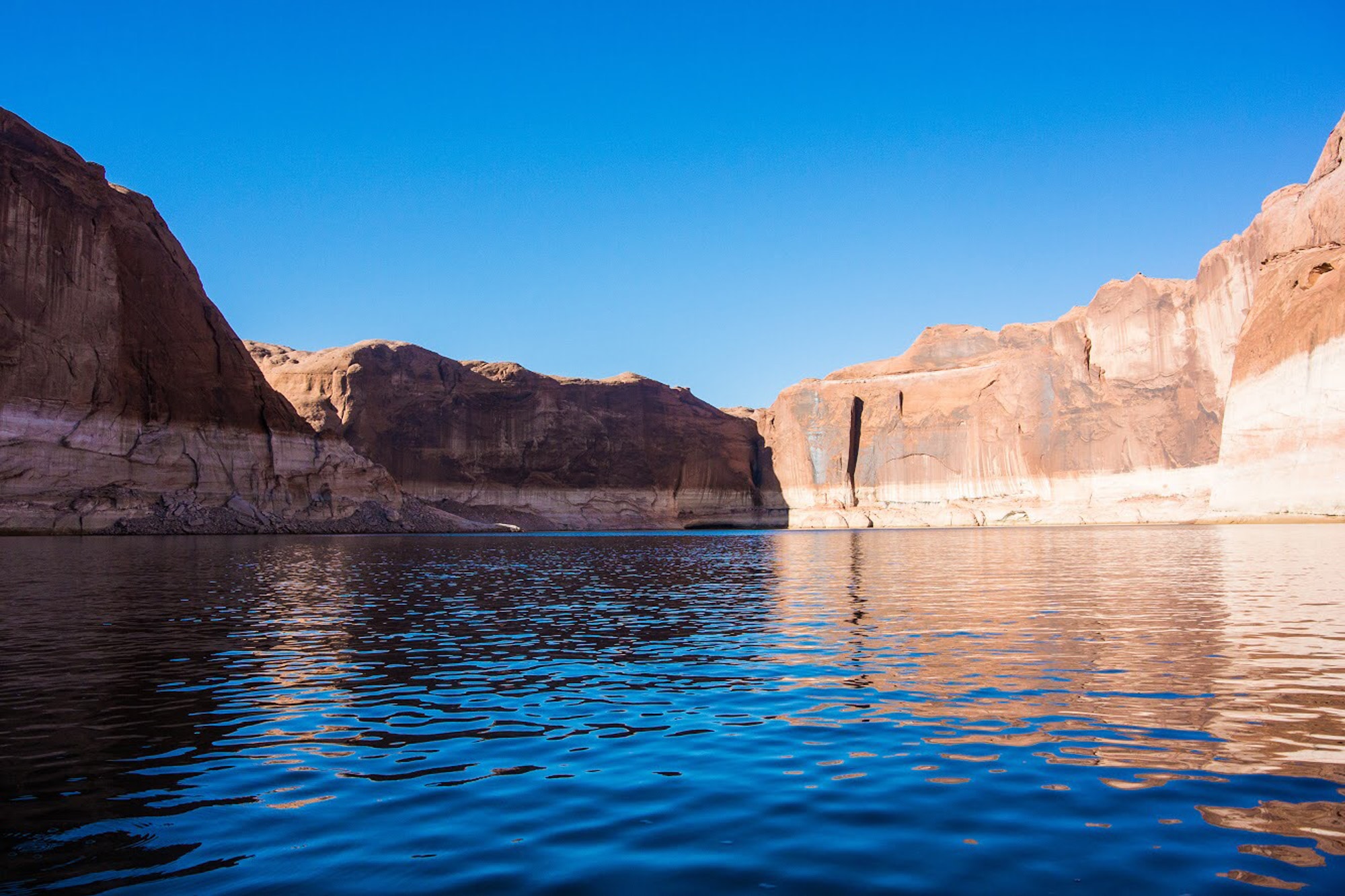 A present-day photo of one of Lake Powell's side canyons. Lake Powell was created by the development of the Glen Canyon Dam between 1956 and 1963.
