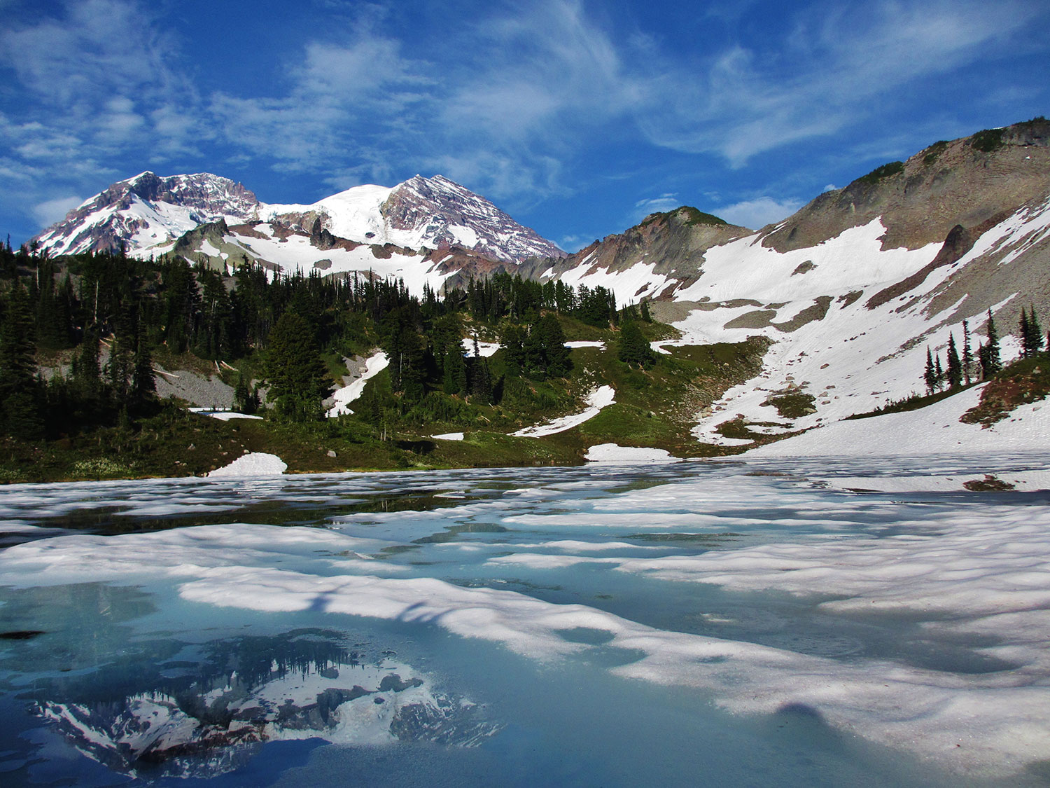 From the moment we saw the Tahoma Glacier pierce through the mists, our enjoyable struggle became bliss. Over the next days we relished the views, new trail friends, shooing bears from our precious food—and diving in nearly iced-over lakes.