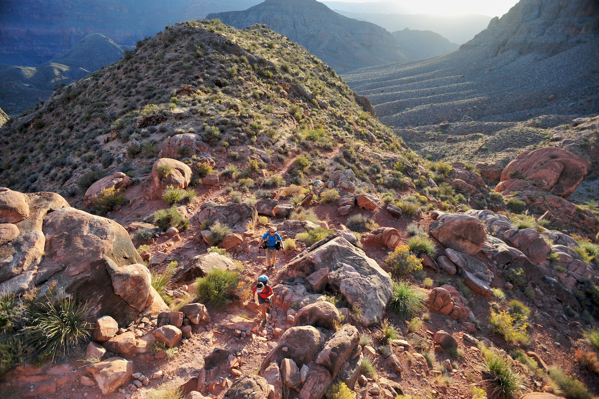 Cameron and Agnes climb out of Surprise Valley through a break in the 400-foot-tall Redwall on the Thunder River Trail.