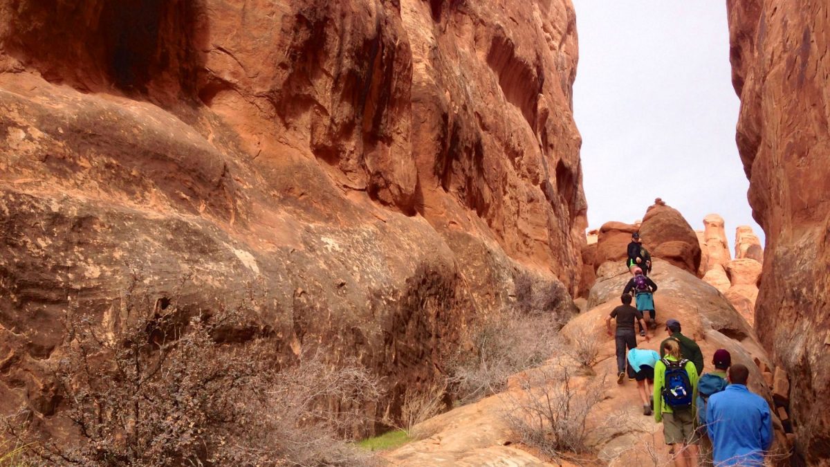 A group hikes single-file in the Fiery Furnace in Arches National Park to reduce erosion.