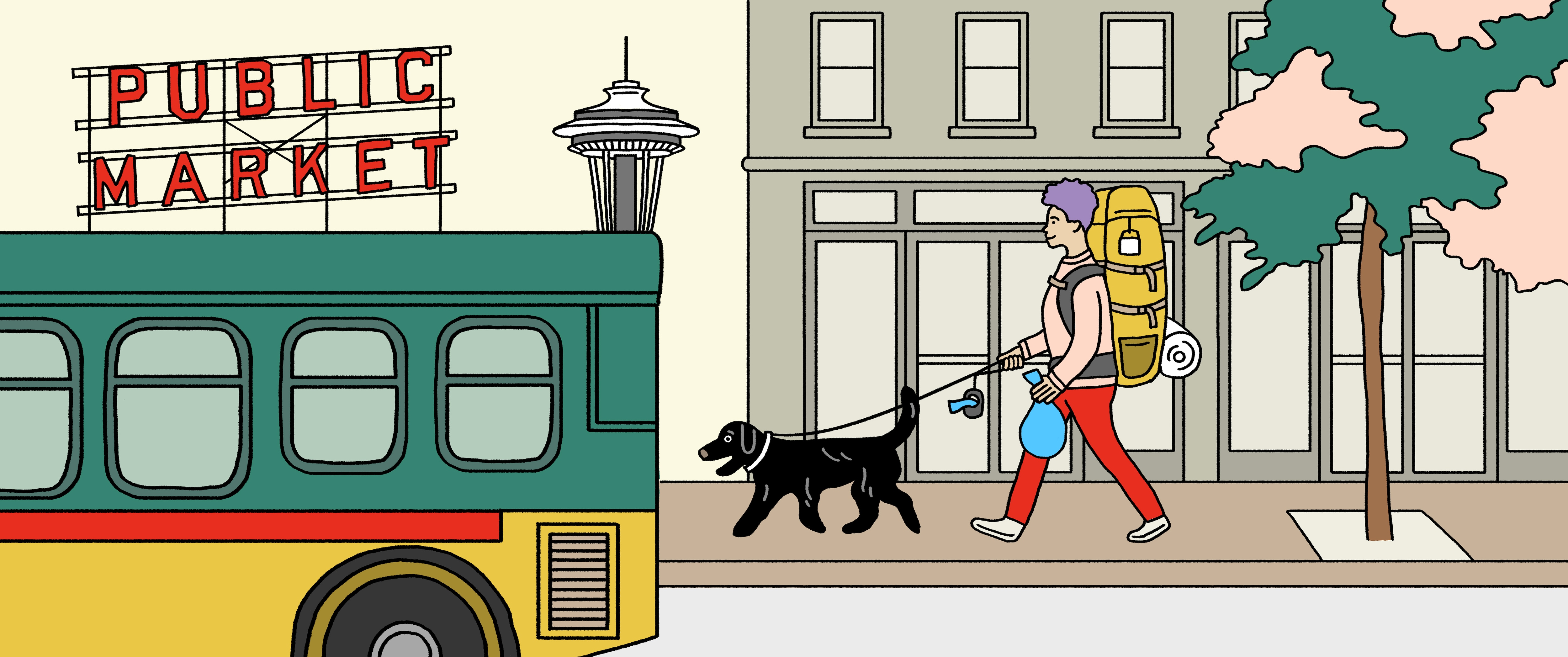July 28, 2019, mile 8.92: I am inside my tent’s vestibule in the front yard of my ex-roommate’s single-story, beige house in the semi-industrial part of Seattle called Georgetown. The thin tent fly separates me from the morning chill, though it does little to drown out the sound of cars flying up the on-ramp to I-90, just 200 feet away. I am squatting, awkwardly (though there’s no other way), trying to aim my pee away from my feet and my now-empty pack without sticking my bare bum into the view of the neighbors. My dog, who has her nose nearly against mine, seems perplexed.