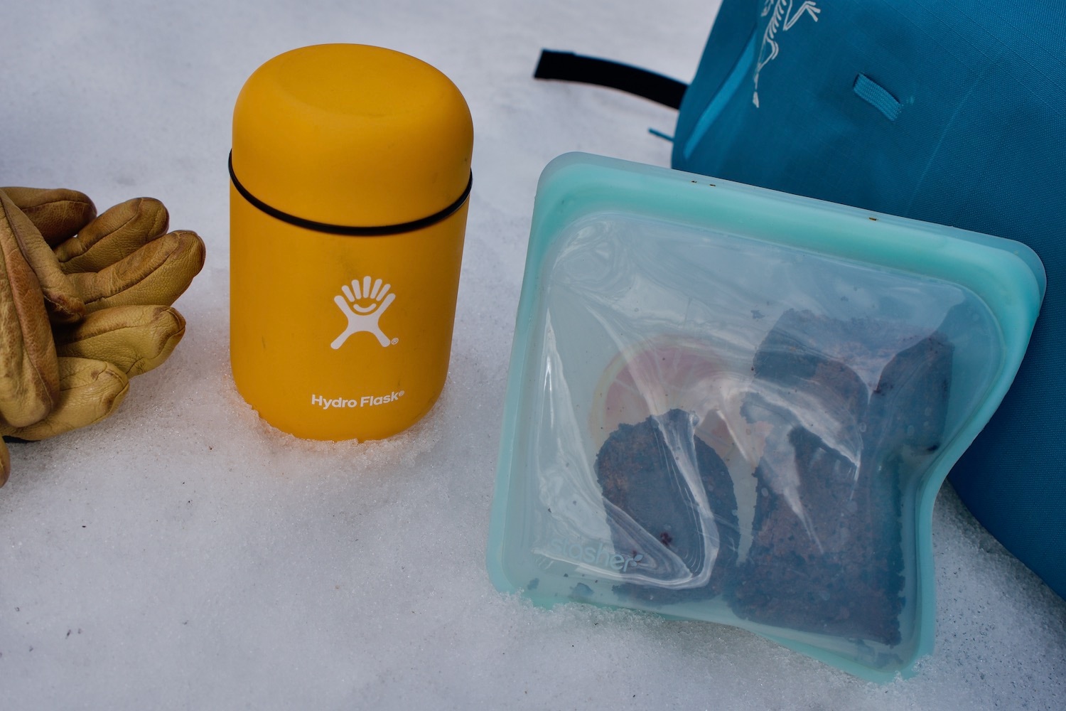 For homemade energy bars, I find they fit into pockets and hold their shape best when wrapped tightly. It’s usually worth a little extra weight to tote along some chili or ramen in my Hydro Flask Food Flask, as a warm cup of soup is just about the best thing you could ask for on a cold, windy summit.