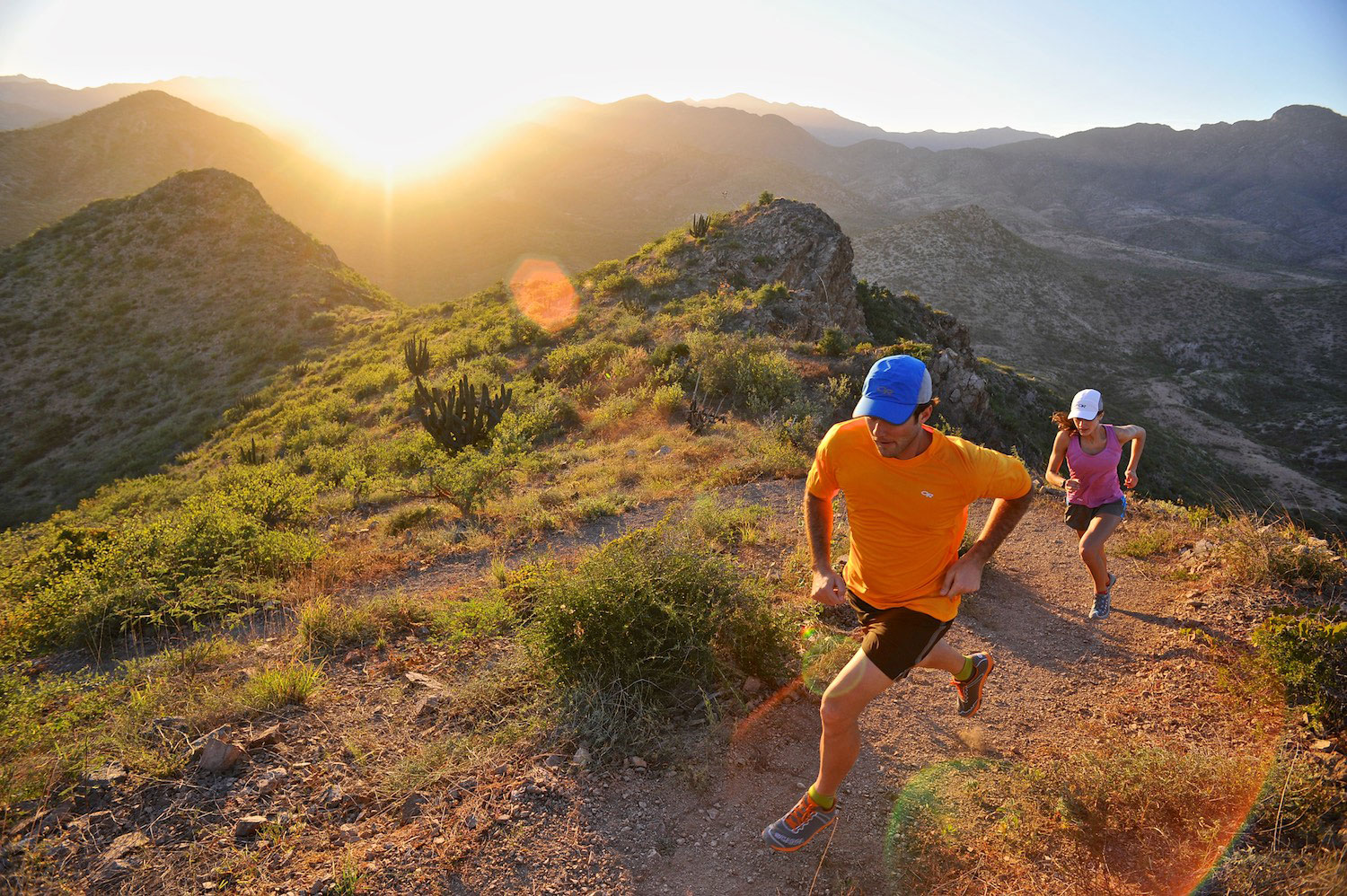 Vince and Christina enjoy a sunset run along the trails above Cabo Pulmo, Baja Sur, Mexico.