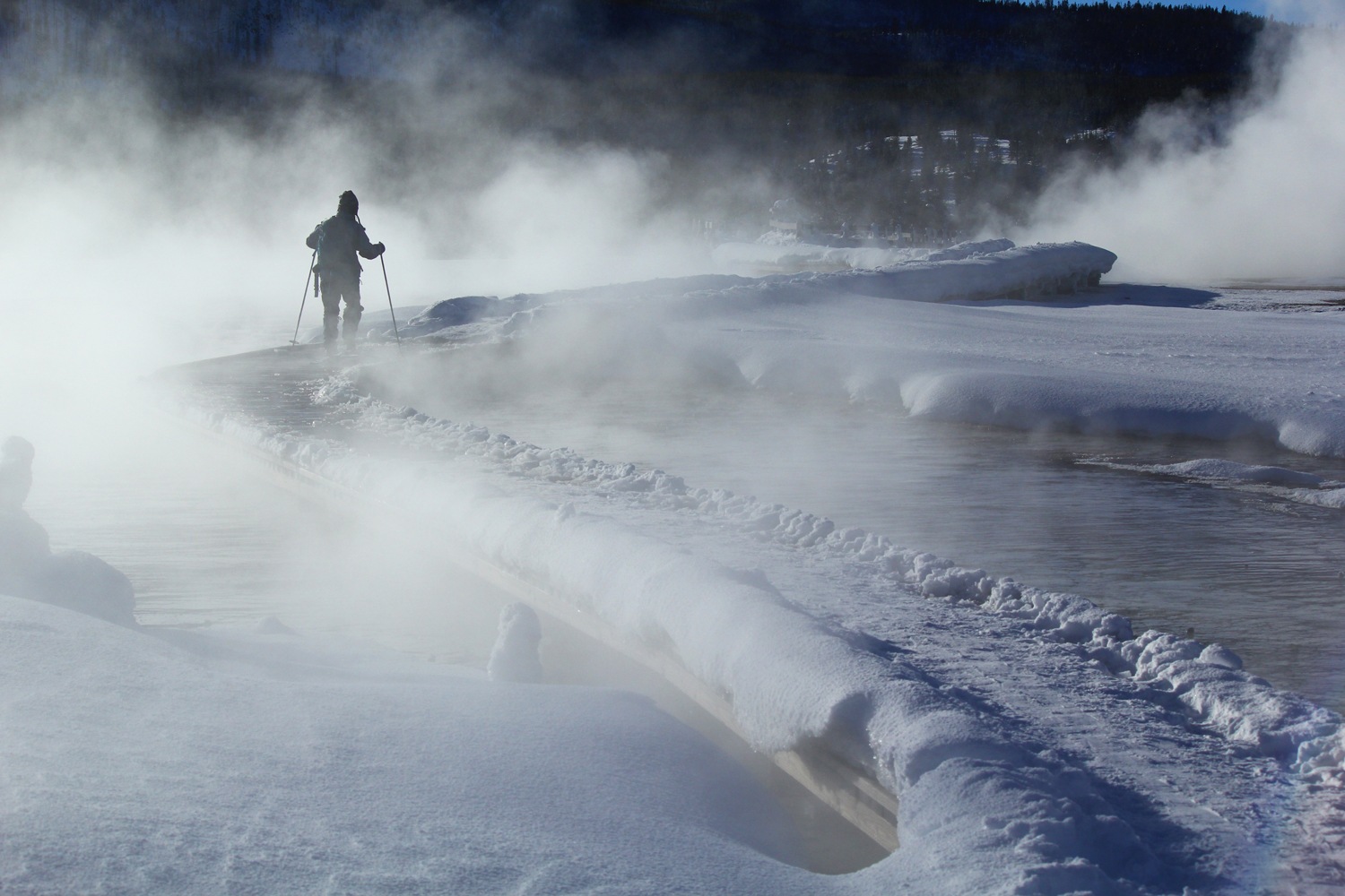 It’s winter solstice and the sun is setting. I’m standing next to my mother on the cross-country ski trail between Castle and Old Faithful geysers watching the skies turn to lavender. Old Faithful has just erupted and the remnant steam still floats high in the air. Rounding the bend, we see a group of bison walking one by one across the open basin in front of us. As they move through a low fog that has settled in, the bison disappear and reappear. I look around—we are the only humans in sight, and the cold sting of the air reminds me why.