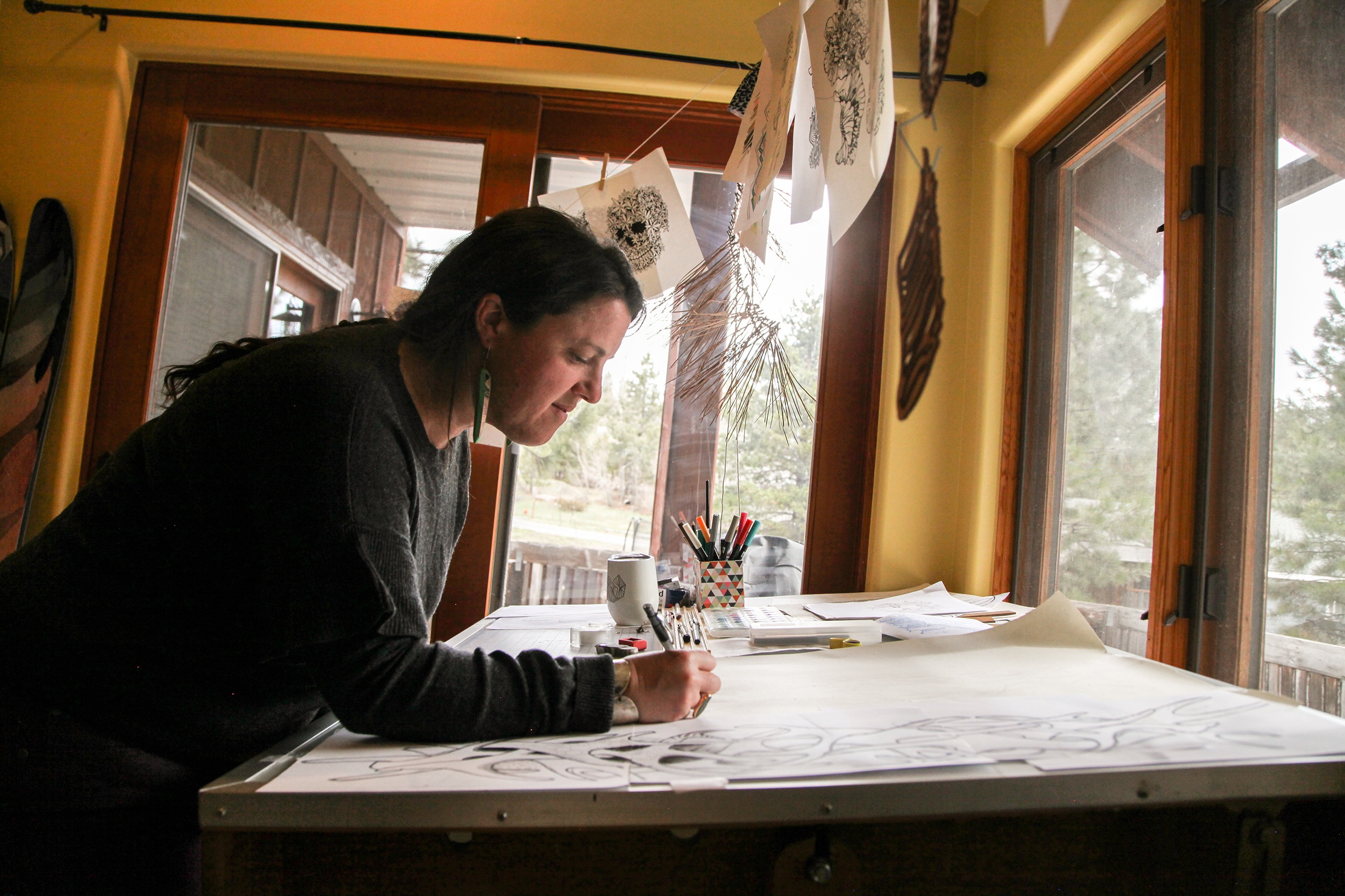 While technology has changed, the essential process remains the same: Three-dimensional artwork becomes a two-dimensional digital file. Bello uses Adobe Illustrator and Photoshop to combine doodles made in a notebook at the coffee shop with the swooping lines of her woodworking projects. Inspiration can be as varied as the hollyhocks in her garden, shed antlers found in the Sierra, and the vivid natural blues and whites of Tahoe winters. The final image must be slightly larger than the ski: often more than six feet long and about 13 inches wide.