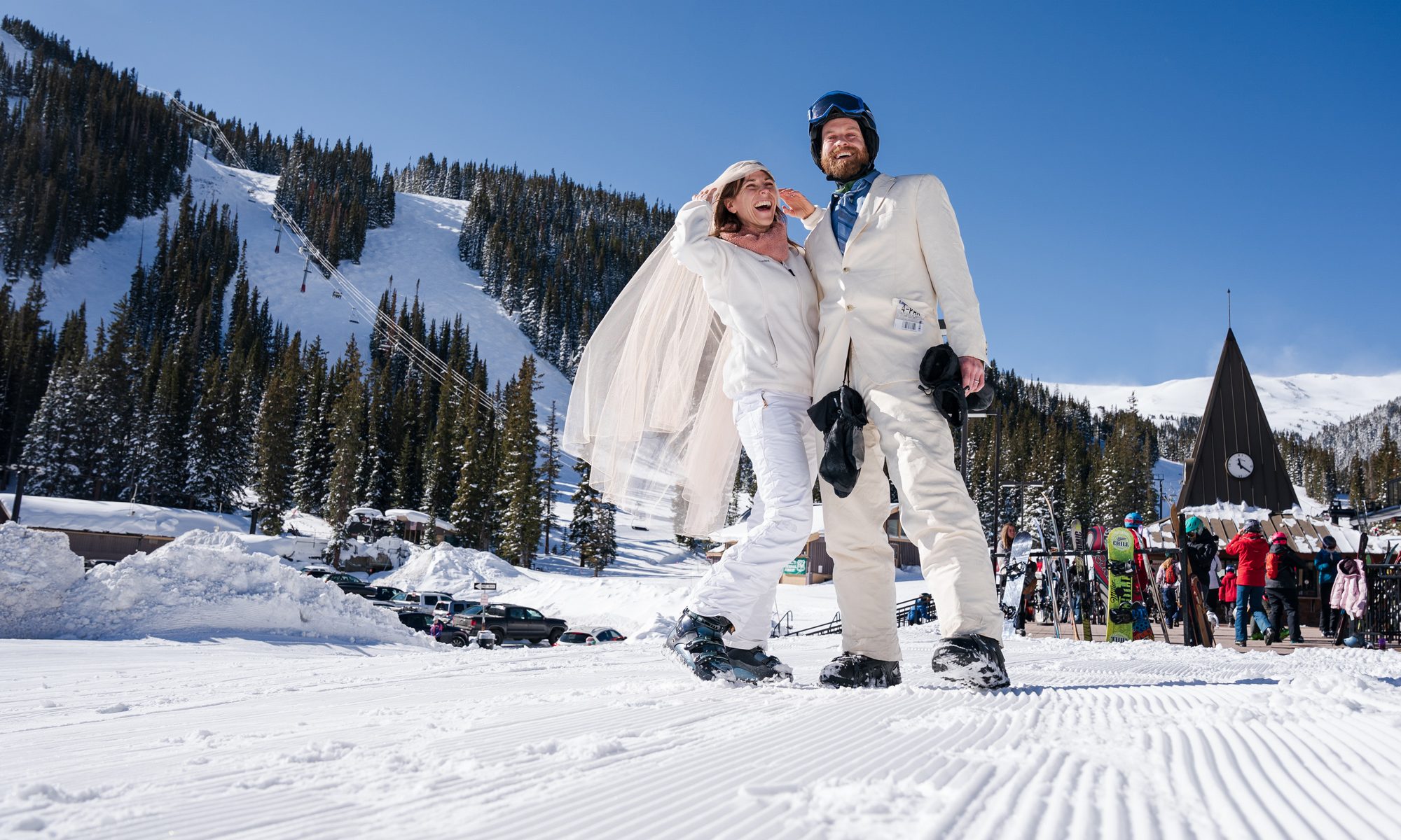About eight of the 80 couples will actually be married today. The rest are here to renew their vows at Loveland’s 29th annual Mountaintop Matrimony mass-wedding service. Most have lift tickets hanging from their jackets that say, “I DO!”—part of a 2-for-1 promotion that Loveland offers to participants. A woman double fists a pair of hard seltzers and glances at her watch. The ceremony was slated to start at noon, sharp. It’s 12:07. Then someone gasps. “Harry has entered the building.”