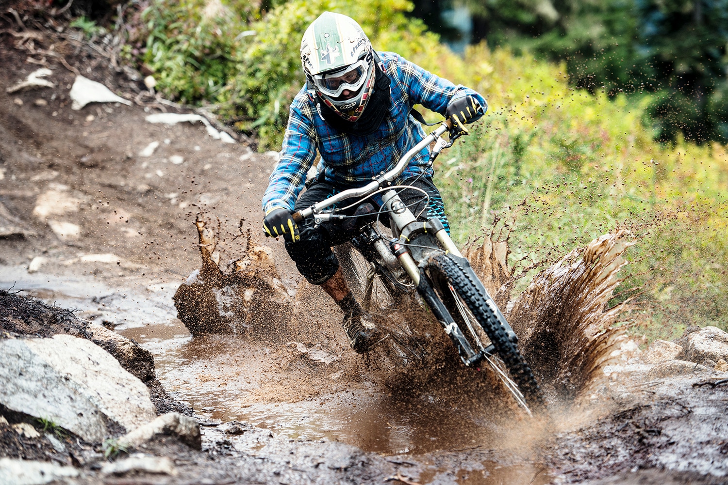 Tom Ford flying through a puddle. Stevens Pass, Washington.