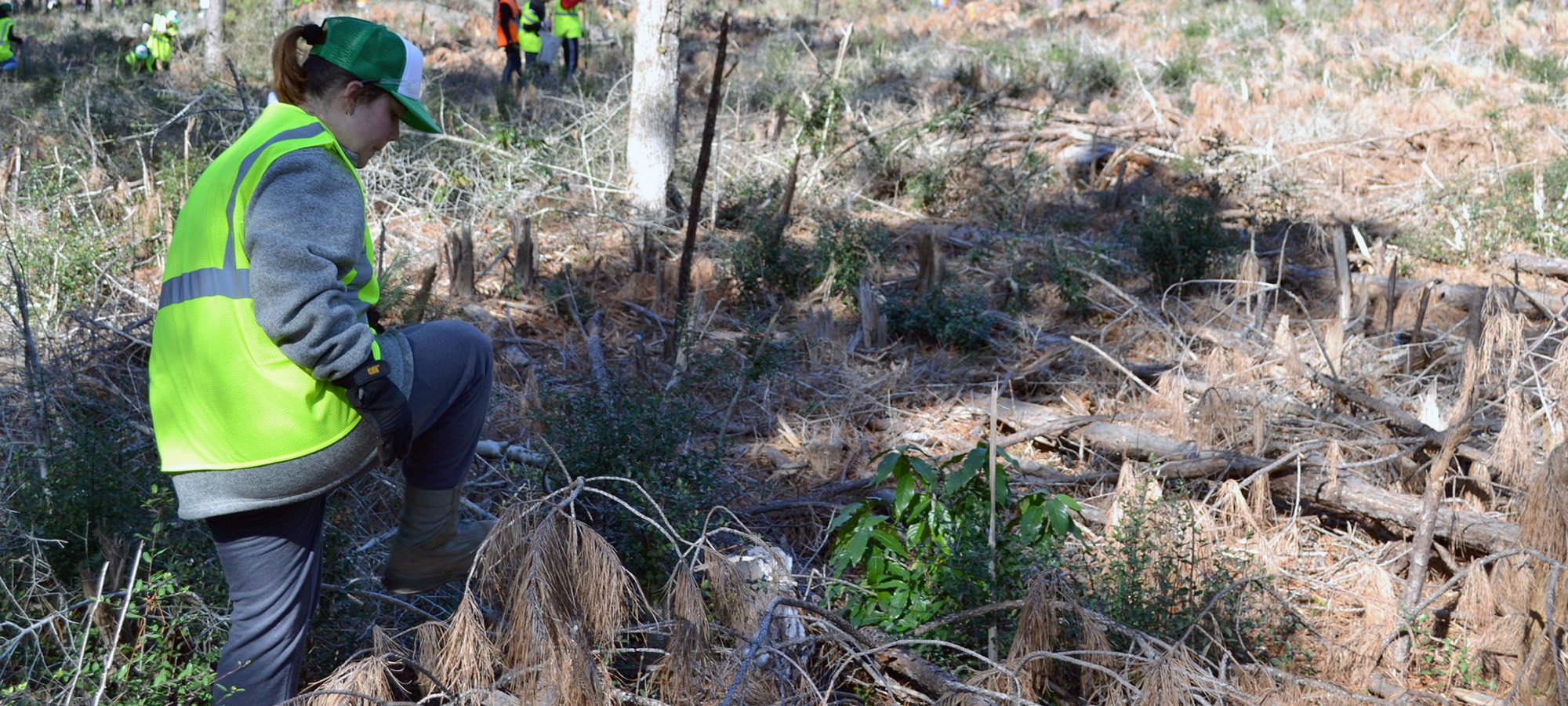 An EmpowHER participant searches for a spot to plant seedlings during a community service project to restore Long Leaf Pine to its range at Big Thicket National Preserve in southeast Texas. (Photo Credit: Angela Gonzales/NPCA)