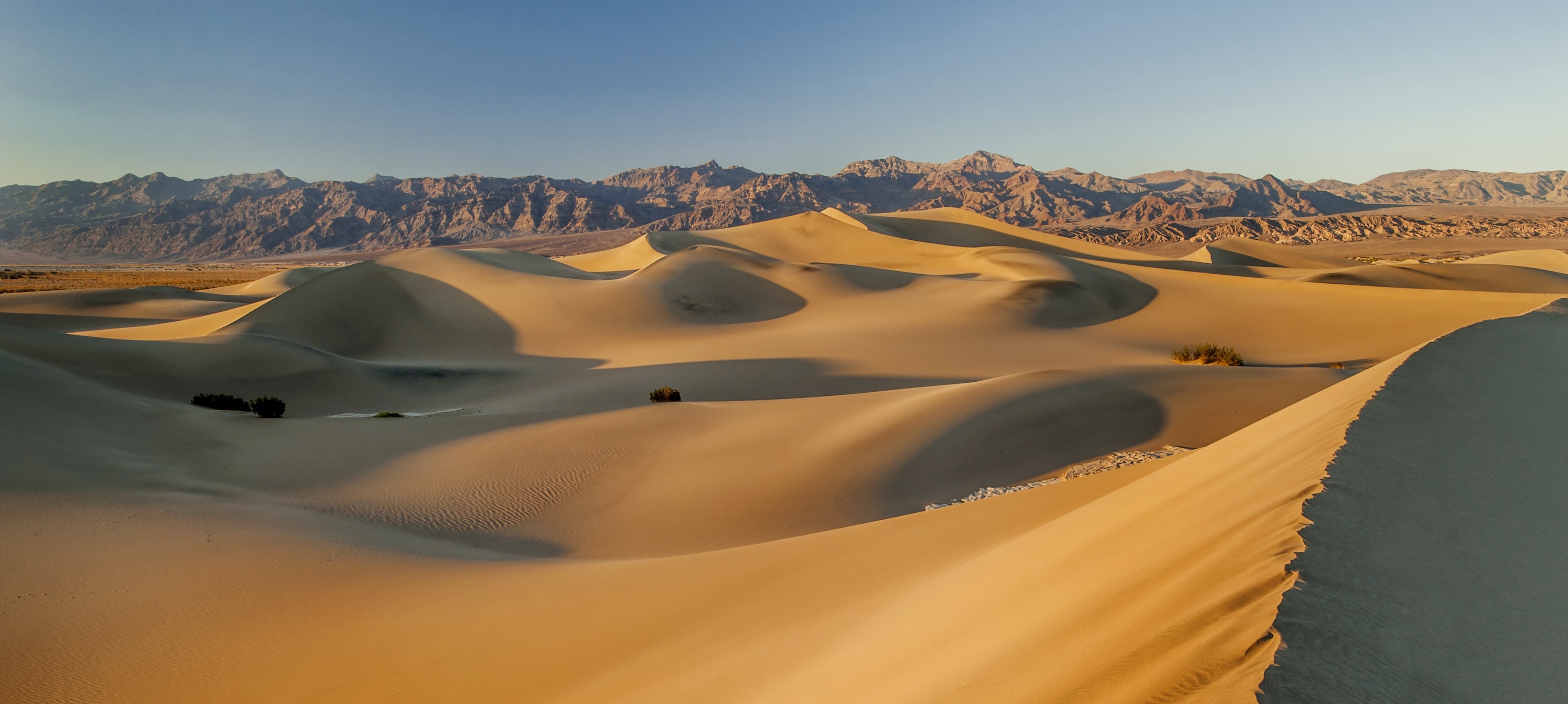 You can see them rising in the distance, and they certainly appear closer than they actually are. The Mesquite Flat Sand Dunes are the largest dune configuration within Death Valley National Park, and incorporate three different types of dunes: crescent, linear and star-shaped. Some of the dunes rise nearly 100 feet from the ancient lake bed floor.