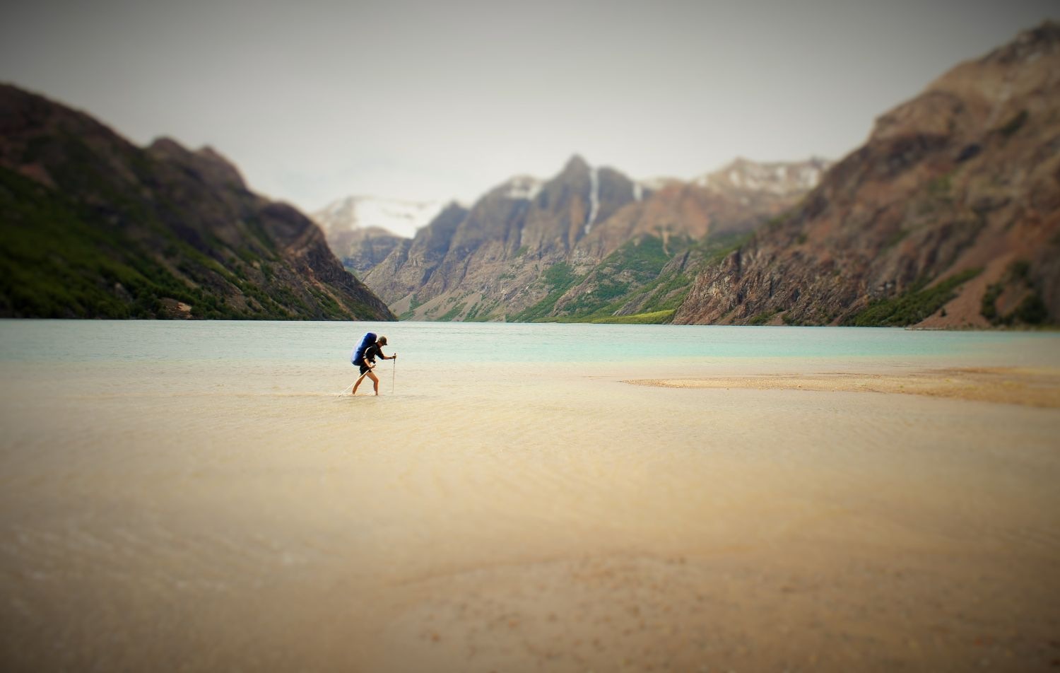 Nick Martin crosses Lago Verde on day two of a three-day, 50-mile backpacking trek from Jeinimeni National Reserve to Chile’s newest national park, Parque Patagonia. Dozens of braided streams flow from the surrounding glaciers causing river and lake levels to rise as the weather warms. Early morning crossings are recommended when the water is at its lowest.