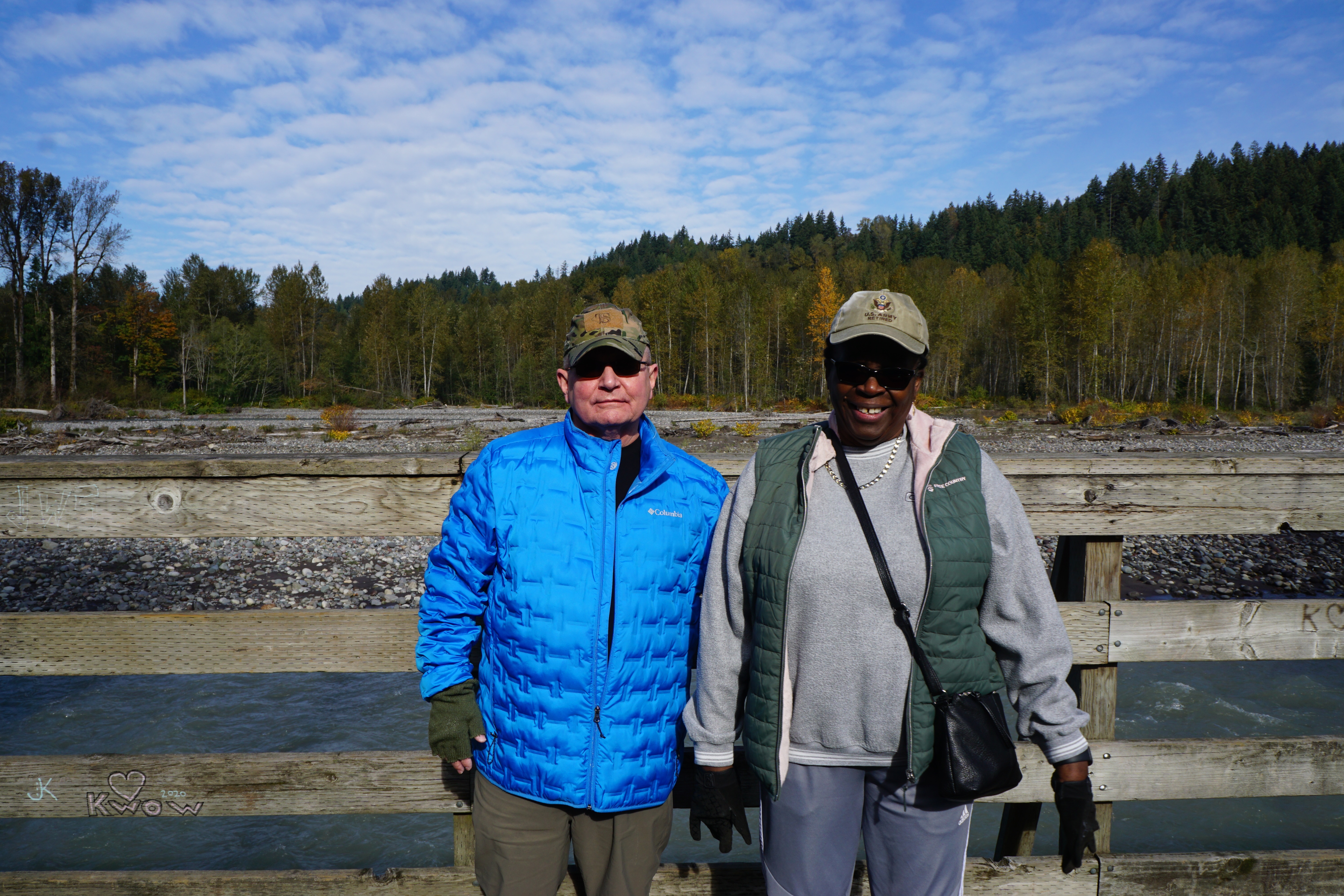 The following year, we invited all our family members to join us on the hike. We hoped anyone and everyone could make it. It was especially meaningful to have my father join us. My father is disabled, and it’s challenging to find a trail that’s both accessible for him and an immersive nature experience. That year, we used trail apps and Google maps to set a course that would be both accessible to my father and give us a beautiful backdrop to connect with each other. We ultimately chose to hike a section of the Foothills Trail near Orting, Washington. The trail is a favorite ADA-compliant trek because it’s paved and hemmed by beautiful deciduous trees with autumnal leaves. It travels along the Carbon River and has a nearby road that makes it easy to arrange a car to pick us up should we need it.