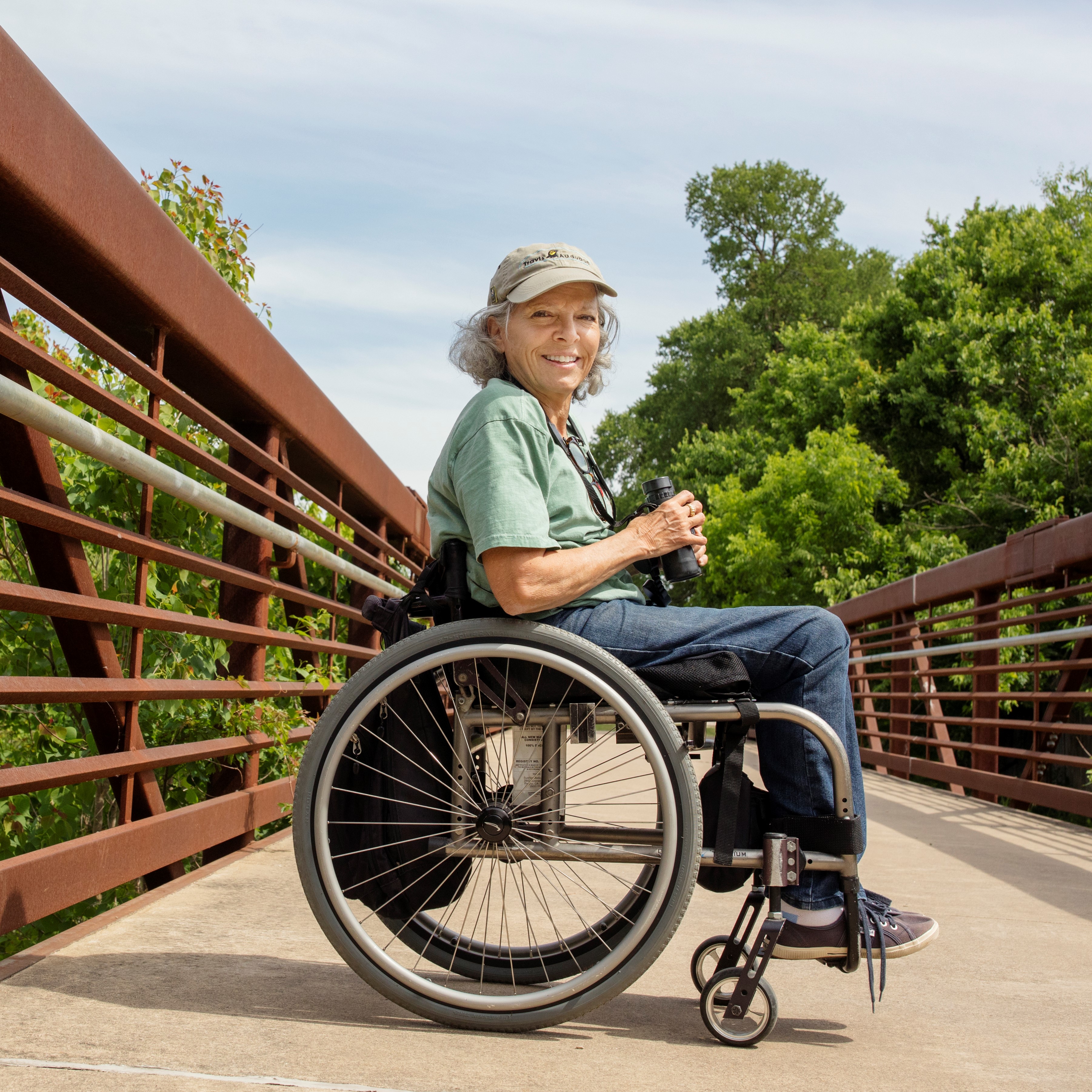 My name is Virginia Rose. I was paralyzed in a horseback riding accident when I was 14 years old and have used a manual wheelchair for 48 years. About 18 years ago, I joined Travis Audubon Society (TAS) in Austin, Texas, where I learned how to bird and discovered my best self and my greatest happiness. I love it so much that I created a tradition to share it with more people