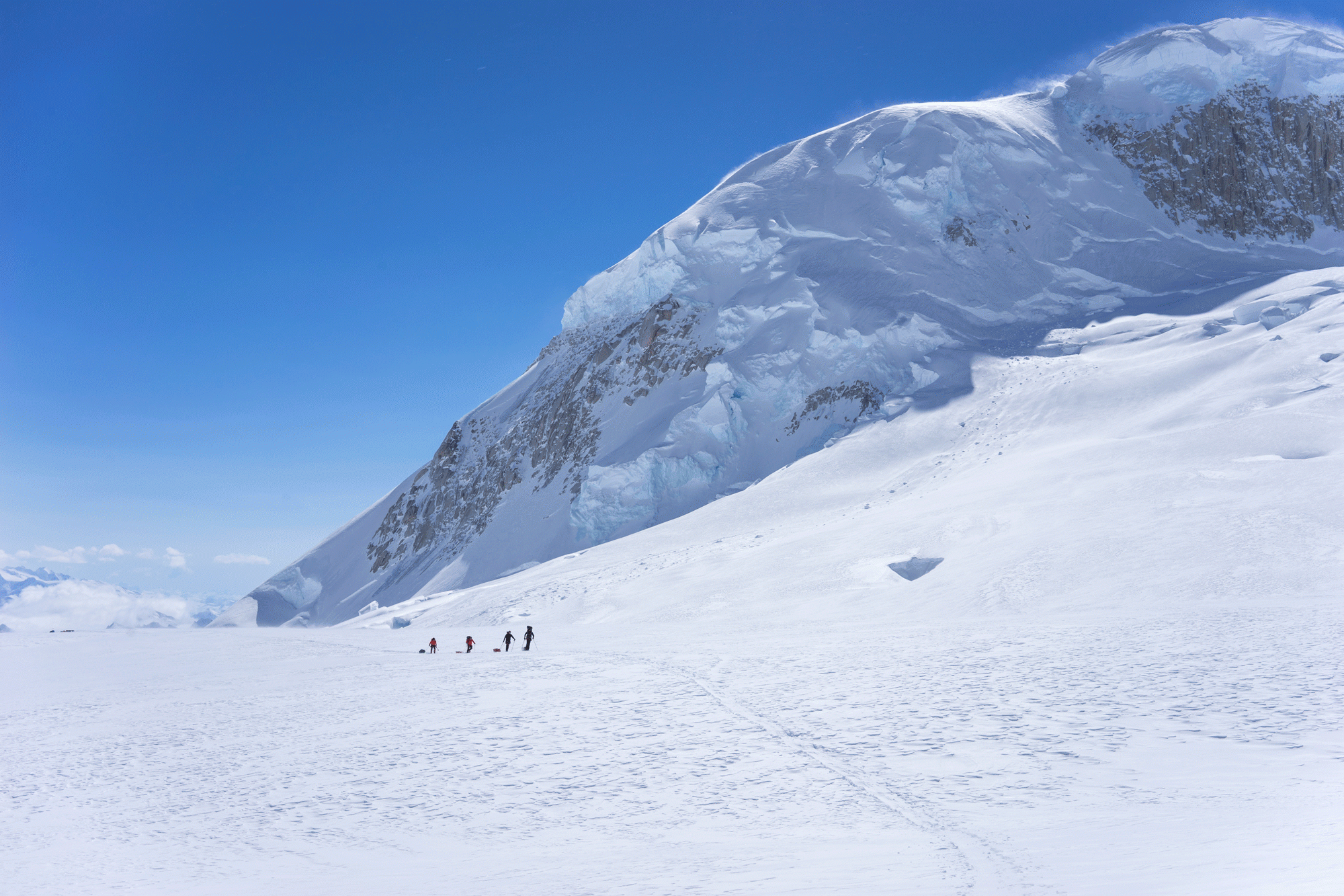 Members of the 2015 anniversary climb haul gear up to a base camp from the landing zone on Mount Kennedy’s Cathedral Glacier. (Photo Credit: Eric Becker)