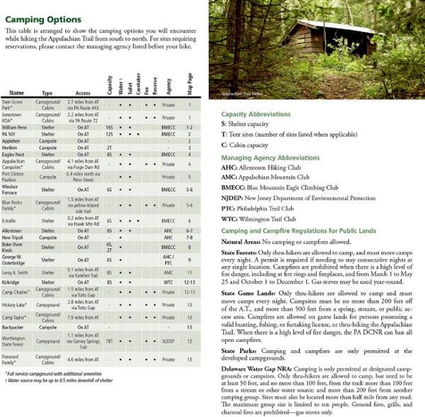 - Helpful trail profiles show the distance between shelters, camping areas and trail access points
