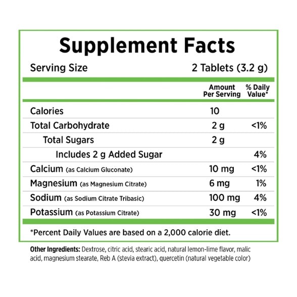 - Each 2-tablet serving contains 100 mg sodium, 30 mg potassium, 10 mg calcium, 6 mg magnesium and just 10 calories