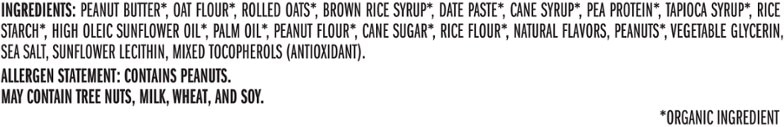 Peanut Butter ingredients: organic peanut butter, organic oat flour, organic rolled oats, organic brown rice syrup, organic date paste, organic cane syrup, organic tapioca syrup, organic pea protein, organic rice starch, organic high oleic sunflower oil, organic palm oil, organic peanut flour, organic dried cane syrup, organic rice flour, organic brown rice protein, natural flavors, vegetable glycerin, organic peanuts, sea salt, sunflower lecithin, mixed tocopherols (antioxidant).