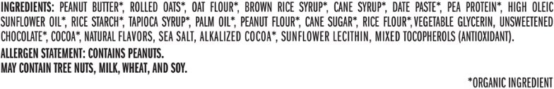 Chocolate Peanut Butter ingredients: organic peanut butter, organic rolled oats, organic brown rice syrup, organic oat flour, organic cane syrup, organic date paste, organic pea protein, organic high oleic sunflower oil, organic rice starch, organic tapioca syrup, organic palm oil, organic peanut flour, organic dried cane syrup, organic rice flour, vegetable glycerin, organic unsweetened chocolate, organic brown rice protein, organic cocoa, natural flavors, sea salt, organic alkalized cocoa, sunflower lecithin, mixed tocopherols (antioxidant).