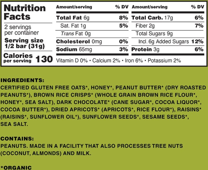 Shop similar products- Organic ingredients include oats, honey, peanut butter, dried apricots, raisins, sunflower seeds and sesame seeds