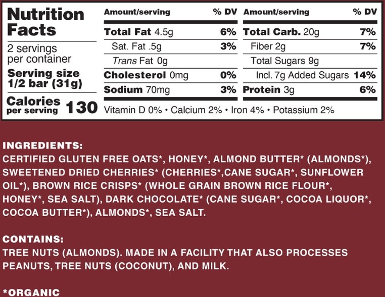 - With 130 calories per serving and only 8 ingredients, this bar is loaded with nothing but delicious, real food energy