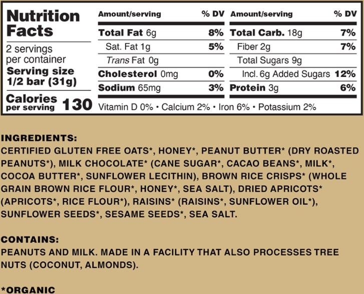 Shop similar products- Organic ingredients include oats, honey, peanut butter, dried apricots, raisins, sunflower seeds and sesame seeds