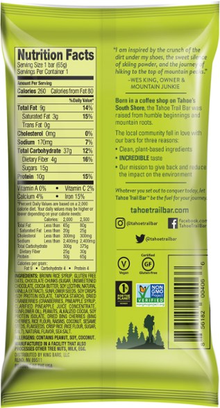 Fueling you for the journey, a Tahoe Trail Bar is a dense, hearty, meal-replacement energy bar offering wholesome ingredients you can both taste and pronounce. It boasts an amazing taste and texture.