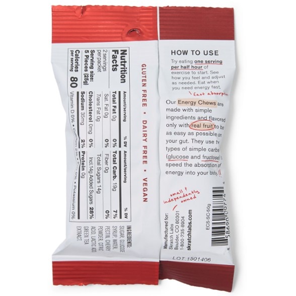 Skratch Labs Sport Energy chews are made with simple ingredients and flavored only with real fruit to provide steady, sustained energy with a clean bite and nothing artificial.