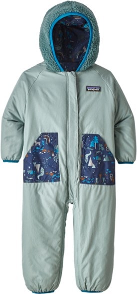 The one-piece Patagonia Reversible Puff-Ball bunting for infants has a 100% recycled polyester taffeta shell fabric that resists wind and a durable water repellent (DWR) that stops wet weather.