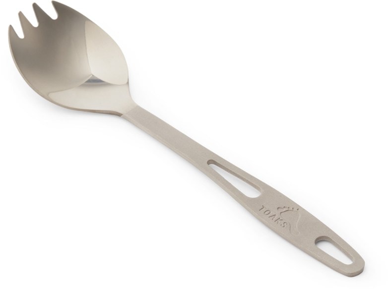 Doubling as a spoon and fork for the ultimate in backcountry dining versatility, the lightweight TOAKS Titanium spork features a matte finish handle and polished bowl.