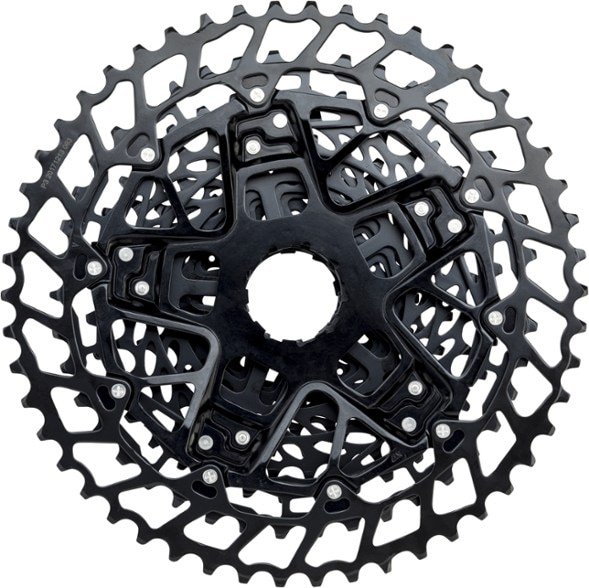 - 8 lightweight, stamped steel cogs and 4 high-strength steel cogs are pinned onto an aluminum spider