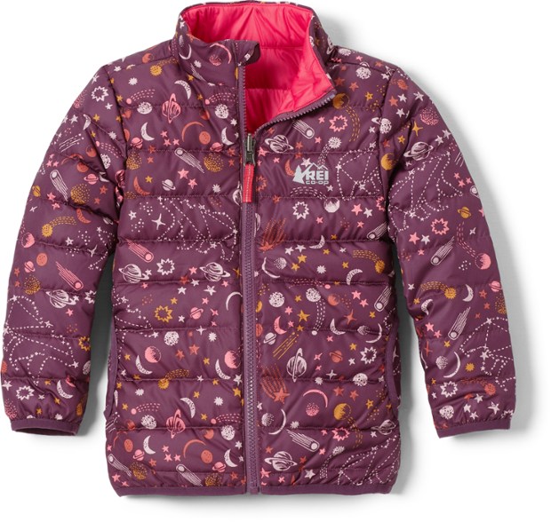 The light and warm REI Co-op 650 Reversible down jacket keeps your toddler cozy while avoiding snowsuit bulk; plus, it reverses in case things get messy—and things always get messy.