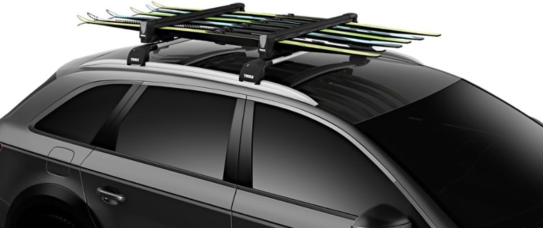 The large Thule SnowPack ski/snowboard rack holds up to 6 pairs of skis or up to 4 snowboards securely with soft rubber arms that grip without scratching the surfaces.