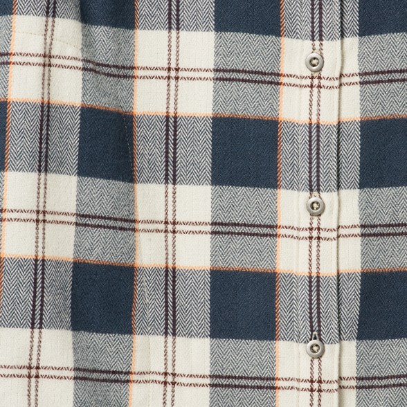 Warm and cozy flannel, runs large. I almost always wear a size large in tops, thanks to my broad shoulders, but I could have actually sized down in this shirt. The cut is a bit boxy, and be aware that since it is made of polyester, this structured cut doesn’t relax like a cotton flannel shirt would.