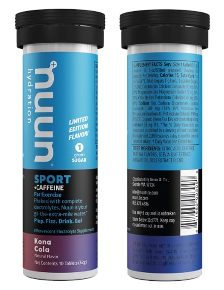 Need a little boost to go the extra mile? NUUN Sport + Caffeine Kona Kola hydration tablets are packed with complete electrolytes to make your water work even harder. Simply plop, fizz, drink and go!